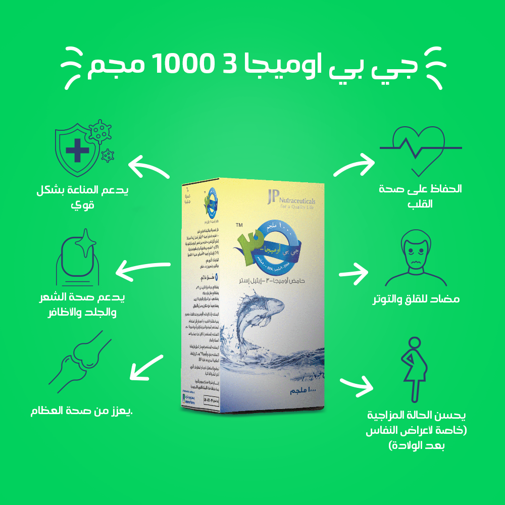 • جي بي أوميجا 3 زيت السمك 1000 مجم مضاد للقلق والتوتر ويحسن الحالة المزاجية (خاصة لأعراض النفاس بعد الولادة).