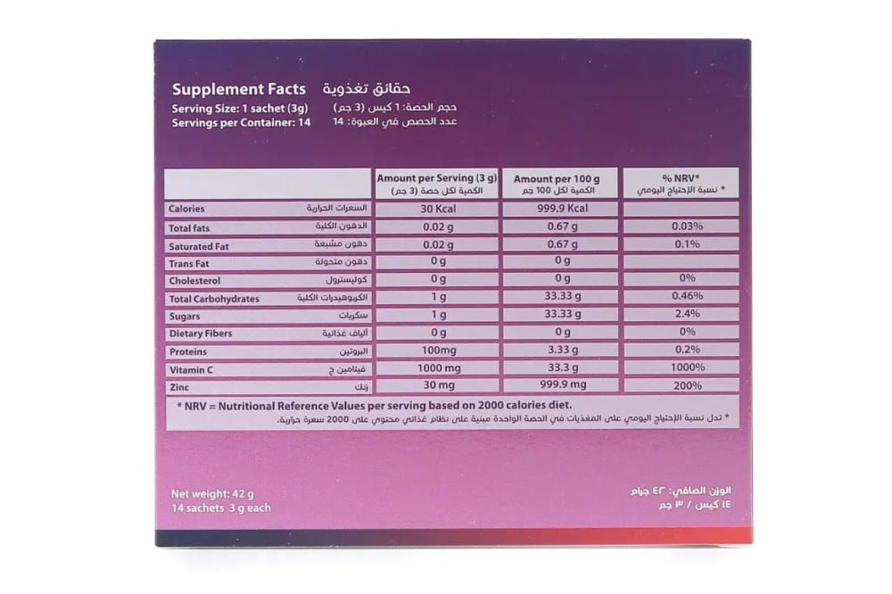 فيتامين ج (ال حمض الاسكوربيك)،جلوك نات الزنك (مصدر الزنك)،نكهه التوت (نكهه طبيعية).