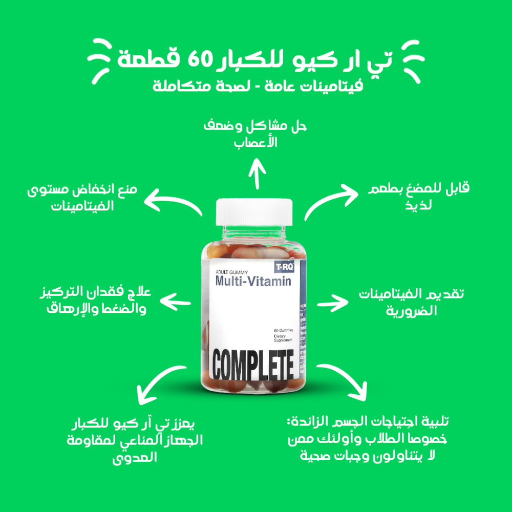 3- تي ار كيو للكبار، منتج أمريكي، يقدم حلاً شاملاً لتجنب نقص الفيتامينات وتلبية الاحتياجات الزائدة للجسم.