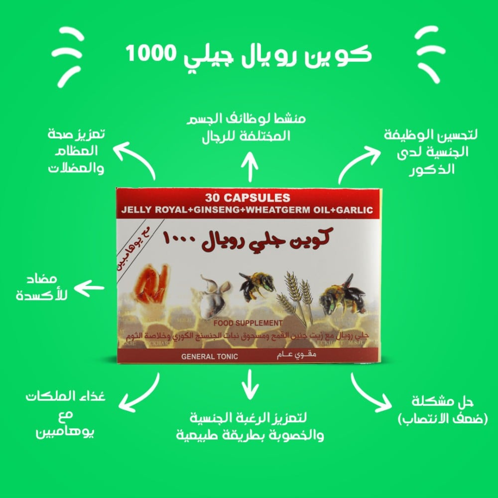 2- كوين رويال جيلي 1000 :غذاء ملكات النحل 1000 مجم ، الجنسنج ، زيت جنين القمح ، يوهمبين ، الثوم ، فيتامين سى و D3 ، الزنك، اليود.