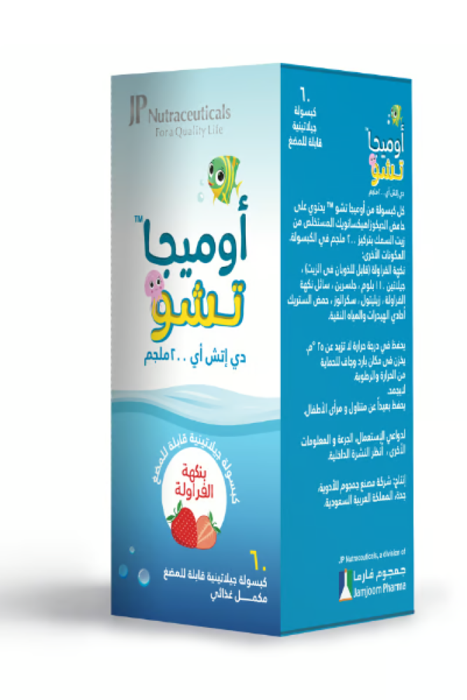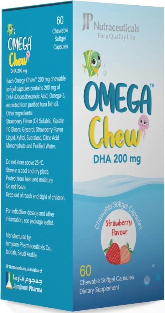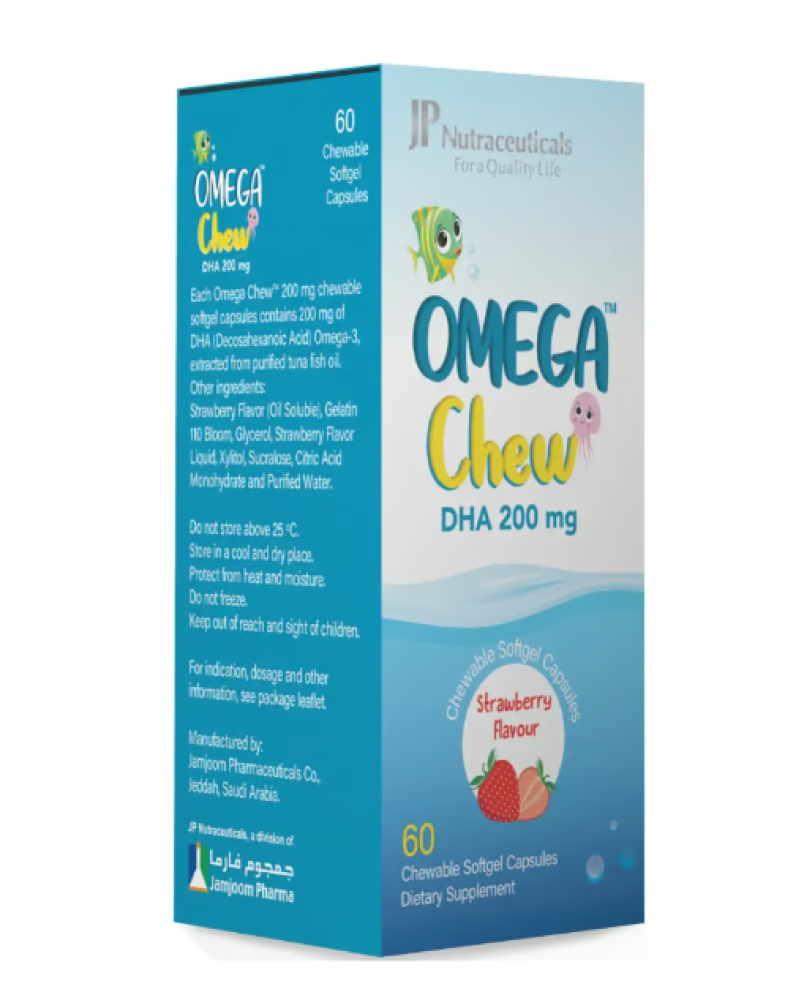 أوميجا تشو مخصص للأطفال اللذين تزيد أعمارهم عن 4 سنوات كمصدر لحامض الديكوزاهيكسانويك المسؤول عن التطور الطبيعي لدماغ الطفل.