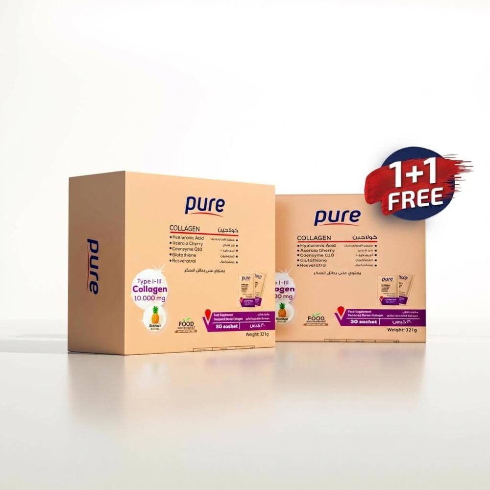 كورس شهرين 1+1 مجانًا من بيور كولاجين 10.000 ملجم ببتايد I و II مع البيوتين 500 ملجم والهيالورونيك والجلوتاثيون والكرز الهندي