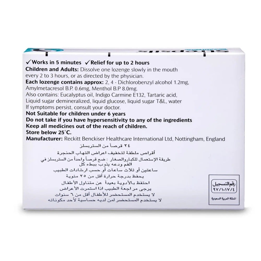 • يعتبر ستربسلز منتول فعال لعلاج التهاب الحلق.