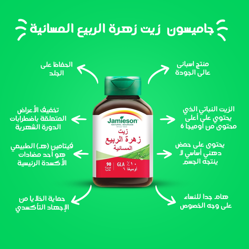 - زهرة الربيع المسائية من جاميسون معروفة بدورها في تعزيز صحة الجلد، دعم التوازن الهرموني، والمساهمة في تخفيف أعراض ما قبل الطمث (PMS).