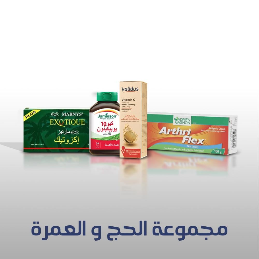 يتضمن المجموعة أيضاً آرثرى فليكس كريم، الذي يحتوي على زيت المنثول وزيت الأوكالبتوس لتخفيف آلام المفاصل والعضلات بسرعة وفعالية، مما يساعدك على الحفاظ على راحتك خلال أداء المناسك. وأخيراً، جاميسون كو انزيم كيو 10 الذي يعزز طاقة الخلايا ويعمل كمضاد للأكسدة على مستوى الميتوكوندريا، مما يحافظ على نشاطك وحيويتك طوال فترة الحج. مع مجموعة الحج، يمكنك التأكد من أنك تتلقى الدعم الغذائي اللازم لضمان تجربة حج مريحة ومثمرة.