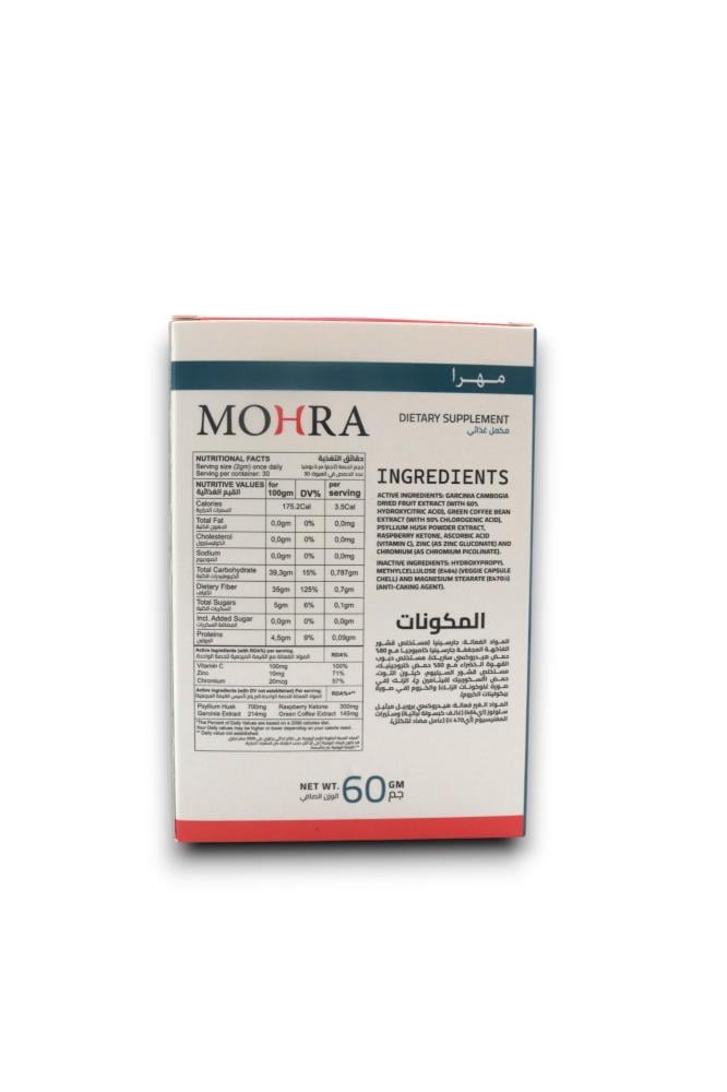 اغتنِم فرصة تجديد روتينك اليومي مع موهـرا؛ مزيج نباتي متكامل يجمع خلاصة جارسينيا كامبوجيا، حبوب القهوة الخضراء، وسيليوم مع كيتون التوت، فيتامين C، الزنك والكروم ليقدّم تجربة عصرية تدعم النشاط والحيوية وتمنح إحساسًا بالتحكّم والرضا طوال اليوم، وكلُّ ذلك في بودرة سهلة التحضير بطعم طبيعي ينسجم مع أي مشروب مفضل.
